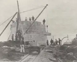 The land base for the construction of the light was Erraid near Iona. Fourteen miles distant from Dhu Heartach across open sea, the little island provided a granite quarry and a shore station once the work on the lighthouse was completed. Initial construction on the rock, which began on 25 June 1867[18] under the supervision of Alan Brebner, required a barrack for the workmen made of iron. Summer gales brought high seas, which resulted in breaking water falling on the roof 77 feet (23 m) above sea level. It held firm, although fourteen men including Brebner were trapped there for five days, and at one point seawater poured in through the trapdoor, swirled around them and exited with their remaining food supplies.[16] Describing a similar occasion, R. L. Stevenson wrote:
