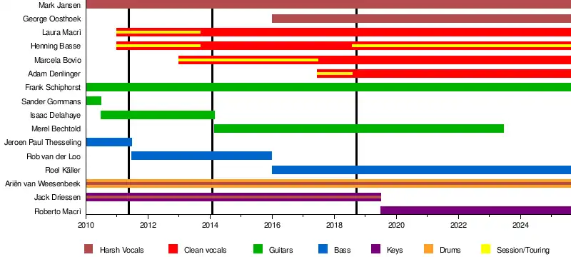 In 2015, Rob van der Loo left the band to focus on Epica and an upcoming new project. Roel Käller took his place as the bassist. Next to that, George Oosthoek (ex-Orphanage) joined the band as growling vocalist. On 21 June 2017, it was announced that Marcela Bovio, former singer of Stream of Passion and a regular collaborator of the band since 2013, was now a full-time member.[6][7][8]