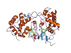 - ^ Fulop V, Ridout CJ, Greenwood C, Hajdu J (November 1995). "Crystal structure of the di-haem cytochrome c peroxidase from Pseudomonas aeruginosa". Structure. 3 (11): 1225–33. doi:10.1016/s0969-2126(01)00258-1. PMID 8591033.