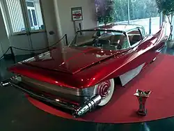 The car was originally powered by a 365 cubic inch Cadillac engine, later replaced by a 427 cubic inch high-performance Ford engine,[3] and had a 125-inch wheelbase, with a tubular aluminum frame and a hand-fashioned soft aluminum body.[4] The car has Batmanesque set of rear fins[2] dominating the bodyline and ruby red hubcaps on whitewall tires. Writer Daniel Vaughan describes it as