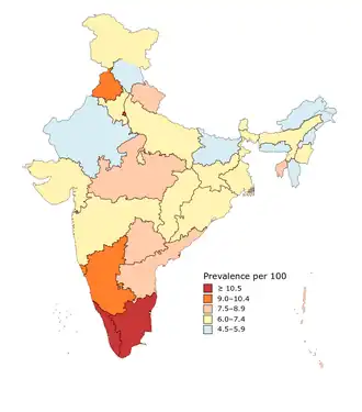 The number of people with diabetes in India has increased from 26 million in 1990 to 65 million in 2016.[1] According to the 2019 National Diabetes and Diabetic Retinopathy Survey report released by the Ministry of Health and Family Welfare, the prevalence was found to be 11.8% in people over the age of 50.[12] The prevalence of diabetes is 6.5% and prediabetes 5.7% among the adults below the age of 50 years, according to the DHS survey.[13] The prevalence was similar in both male (12%) and female (11.7%) populations. It was higher in urban areas.[14] When surveyed for diabetic retinopathy, which threatens eyesight, 16.9% of the diabetic population aged up to 50 years were found to be affected. Per the report, diabetic retinopathy in the 60-69-years age group was 18.6%, in the 70-79-years age group it was 18.3%, and in those over 80 years of age it was 18.4%. A lower prevalence of 14.3% was observed in the 50-59-years age group.[12] High prevalence of diabetes is reported in economically and epidemiologically advanced states such as Tamil Nadu and Kerala, where many research institutes which conduct prevalence studies are also present.[15]