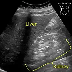 Ultrasonography showing hyperechogenicity of the renal cortex, visualized in the image as brighter than the liver.