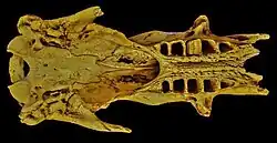 Diabolotherium is a relatively small member of the Megatherioidea, though its specific phylogenetic position is unclear. It is known from a number of individual bones and a partial skeleton. A complete skull is known, but has not yet been described.[3] Based on the fragmentary skull of an immature individual, the profile line of the parietal bones was slightly arched. Most likely a crest was formed in adult individuals. When viewed from behind, the occiput had a rectangular shape, being low and relatively wide. The joints for the cervical vertebrae pointed slightly downwards and were not very prominent, a feature that also occurs in several extinct representatives of the Megalonychidae of the Caribbean islands. The posterior section of the zygomatic arch started directly in front of the ear canal on the temporal bone. It was extremely short, positioned at an angle of 25° to the central axis of the skull and curved slightly downwards. The front part of the arch began on the upper jaw above the second and third tooth. The lower jaw is only known in fragments, the two most complete specimens so far differ in size by 10%. The anterior, spatulate extension of the symphysis, which is typical of numerous sloths, has only been preserved in its posterior part; the full length is unknown. At the base of the process, there was an outer mental foramen, an inner one being positioned 14 mm in front of the first tooth. The lower jaw reached its greatest height below the first tooth and measured 3.4 cm there. It became continuously lower towards the rear, making that for the Megatheriidae and Nothrotheriidae characteristic protuberance of the lower margin of the lower jaw was missing. The articular process protruded so that the mandibular joint was at least 4.5 cm above the posterior angular process (angular process).[2][4]