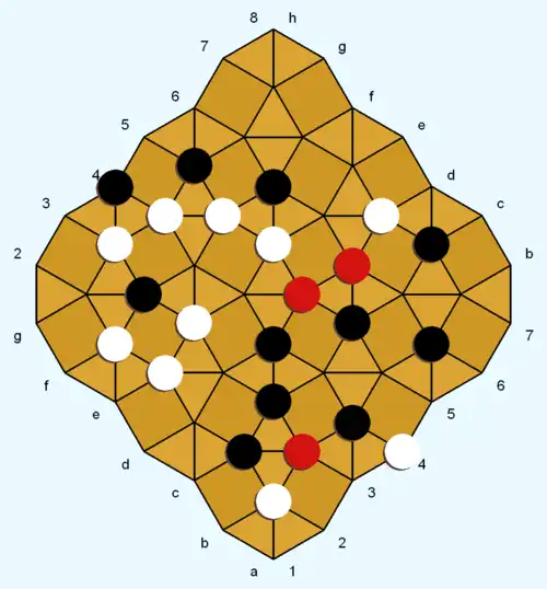 Capturing moves are possible in the Movement phase. If the points of a triangle contain exactly one white and one black piece, either player can capture the opponent piece by occupying the remaining open point ("cornering" the enemy piece on the triangle). The captured piece can be cornered on one triangle (see Example 1), or simultaneously cornered on two different triangles (Example 4). The captured piece is immediately removed from the game and replaced on its point by a neutral piece.[2]