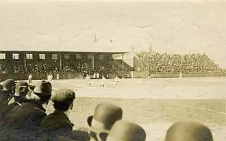 The Maple Leafs, who had been playing at Hanlan's Point Stadium on the Toronto Islands were sold in 1900 to a group of 52 Toronto businessmen, spearheaded by Ed Mack, a tailor and former baseball player. The organization decided to construct a new stadium for the team on the mainland, which they named Diamond Park.[3] The stadium was not ready in time for the 1901 season, forcing the team to play its first 13 games on the road. The team played its first game in the new stadium on May 10, 1901, to 5,200 fans, losing 6–5 to Worcester. The game was preceded by a parade from downtown to the stadium. The ceremonial first pitch was thrown by School Inspector James L. Hughes.[4] Tickets for the games cost 25 cents for general admission, 40 cents for the grandstand and 50 cents for reserved seating.[5]