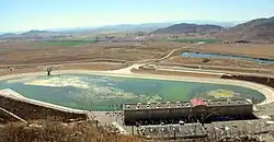 Diamond Valley Lake is located within the Domenigoni/Diamond valleys, between the Domenigoni Mountains and Rawson Mountains, 4 miles (6.4 km) southwest of the city of Hemet. The site was chosen because of its location between the cities of San Diego and Los Angeles, and because of the raw materials located on-site for the construction of the three dams. The location was also chosen because of its proximity, about 5 miles (8.0 km), to the existing Colorado River Aqueduct that originally supplied the lake with water.[3]