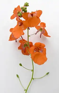 Their common name is twinspur, in reference to the two (usually downward-pointing) spurs to be found on the back of the flower.[3] These help to distinguish them from the similar (and closely related) genera Alonsoa and Nemesia. The spurs contain a special oil, which is collected in the wild by bees of the genus Rediviva (e.g. R. longimanus) that appear to have coevolved with the plants, as they have unusually long forelegs for collecting the oil.[4][5]