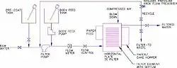 Fluids, commonly known as slurry, often consists of a mixture of particles varying in size which can not be efficiently filtered out by the main D.E. filter. Build up of such particles can increase pressure which results in reduced flow of liquid and a nonfunctional filter. To prevent this, the filtration process can include additional filter aid to distribute certain particles to prevent any problems that hinder the filtration process.[14] Filter aid are solid particles that can improve the permeability and porosity to improve filtrate clarity by trapping specific sized particles while allowing continuous flow of liquids. When filter aid builds up it has a high porosity; although the volume may accumulate, approximately fifteen percent of the total volume is solid, which leaves the rest to be empty space.[15] These filters can serve as a precoat that is applied prior to the filtration process. It is pumped through the filter press, simultaneously creating a porous filter cake on the specified filter cloths. Body feed is an additional filter aid which is often pumped throughout the whole filtration process to improve clarification and prevent build up of filter cake. Build up the filter cake can be detrimental as it becomes impermeable and can block the continuous flow of slurry. Usually, body feed is coarse and has a greater volume, which can assist filter cake build up while allowing particles to be efficiently removed.[16] The pre-coat tank and body feed tank generally serve the same purpose which is to filter out larger particles that can impede the filtration process. Depending on the purity of the initial slurry, the quantity needed of either the body feed or pre-coat can vary.