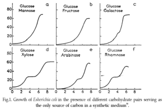 Jacques Monod discovered diauxic growth in 1941 during his experiments with Escherichia coli and Bacillus subtilis. While growing these bacteria on various combination of sugars during his doctoral thesis research, Monod observed that often two distinct growth phases are clearly visible in batch culture, as seen in Figure 1.