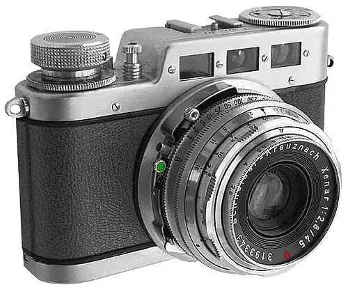 A characteristic model was the Diax Ia for interchangeable lenses, with 3 different viewfinders in the top, each in a different color: blue for 35mm lenses, yellow for 85 or 90mm lenses and neutral for 45 or 50 mm lenses. The Diax II, Diax IIa and Diaxette models were rangefinder cameras. The b models were like the a models, but with a rapid film advance lever. The Diax system also included 10 lens types covering 6 focal lengths with a common filter thread size of 40.5mm.[1]