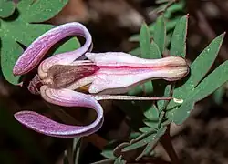Dicentra uniflora, the longhorn steer's head, is a herbaceous perennial flowering plant growing from a tuber, native to gravelly soils in mountains of the western United States.