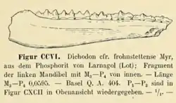 In 1852, German palaeontologist Christian Erich Hermann von Meyer, writing to his colleague Heinrich Georg Bronn, told of fossils of Dichodon from the locality of Frohnstetten whose dentition did not resemble that of the species D. cuspidatus. He determined based on its molars that it was therefore a new species, which he named D. Frohnstettensis.[a][4]