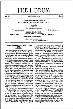 Dickinson Law Review is the flagship law review of Penn State Dickinson Law. Founded in 1897 as The Forum, it is the fifth oldest law review in continuous print in the United States.[1] From 1898–1899, Julia Radle, the first female student in the school's history, was the editor-in-chief of the law review. It is believed that Ms. Radle may have been the first female in the United States to serve in this capacity.[2]