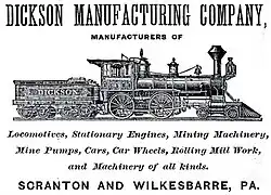 Dickson Manufacturing Company was an American manufacturer of boilers, blast furnaces and steam engines used in various industries but most known in railway steam locomotives. The company also designed and constructed steam powered mine cable hoists. It was founded in Scranton, Pennsylvania by Thomas Dickson in 1856. In total, the company produced 1,334 steam locomotives until it was taken over by ALCO in 1901.[1]