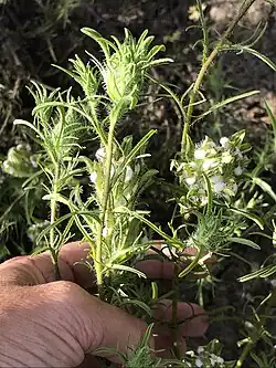 Dicranostegia is a monotypic genus of hemiparasitic flowering plants belonging to the family Orobanchaceae,[3] containing the species Dicranostegia orcuttiana, commonly known as Orcutt's bird's beak or Baja bird's beak.[4] It is near-endemic to Baja California, found from Miller's Landing north to Tijuana,[5] but has a few occurrences in southern San Diego County, California. It is differentiated among other similar species (like Cordylanthus spp.) in California by its leaves with 8 to 11 lateral lobes that are paired.[6] It was formerly placed in the genus Cordylanthus until phylogenetic analysis led to it being split off.[7] This species is threatened by the destruction of its habitat from urbanization.[4]
