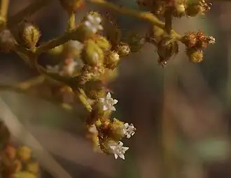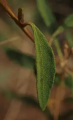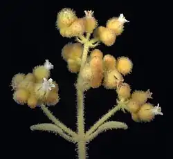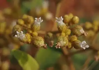 Dicrastylis exsuccosa is a shrub 0.3 to 1.5 m high which grows on sand-dunes and plains.[5] It flowers from April to November. The opposite leaves are 1 to 10 cm long and about 1 to 2 cm wide, covered with dendritic hairs, and having smooth edges[5] The stem cross-section is roughly circular. The flower has five stamens and a five-lobed calyx, with a corolla which is white or cream.[5]