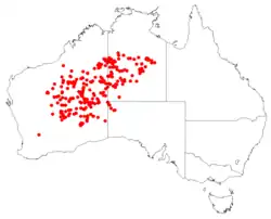 In Western Australia it is found in the IBRA regions of Little Sandy Desert, Gascoyne, Central Ranges, Gibson Desert, Great Sandy Desert, Tanami, Great Victoria Desert or Murchison.[5]