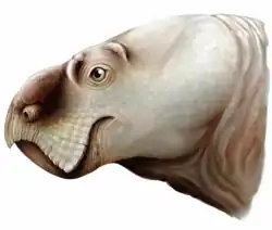 The dicynodont skull is highly specialised, light but strong, with the synapsid temporal openings at the rear of the skull greatly enlarged to accommodate larger jaw muscles. The front of the skull and the lower jaw are generally narrow and, in all but a number of primitive forms, toothless. Instead, the front of the mouth is equipped with a horny beak, as in turtles and ceratopsian dinosaurs. Food was processed by the retraction of the lower jaw when the mouth closed, producing a powerful shearing action,[3] which would have enabled dicynodonts to cope with tough plant material. Dicynodonts typically had a pair of enlarged maxillary caniniform teeth, analogous to the tusks present in some living mammals. In the earliest genera, they were merely enlarged teeth, but in later forms they independently evolved into ever-growing teeth like mammal tusks multiple times.[4] In some dicynodonts, the presence of tusks has been suggested to be sexually dimorphic.[5] Some dicynodonts such as Stahleckeria lacked true tusks and instead bore tusk-like extensions on the side of the beak.[6][7]: 139