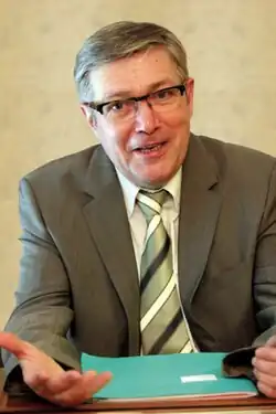 Mouly ran in the 2014 municipal election in Narbonne as the head of the DVD list.[3] He earned 27.13% of votes in the first round and 45.19% of second-round votes,[4] enough to elect him Mayor of Narbonne.[5] He benefitted from the withdrawal of the Union for a Popular Movement-Union of Democrats and Independence list, which helped him to defeat outgoing Socialist Party Mayor Jacques Bascou.[6] However, Bascou filed an appeal for the annulment of the election,[7] which was rejected by the administrative court in Montpellier.[8] In his first term, Mouly promised to focus on the development of employment, security, video surveillance, and decrease taxes.[6] He also strengthened ties between Narbonne and Béziers, led by Robert Menard.[9][10][11]