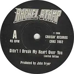 "Didn't I Break My Heart Over You" is a single by London glam rock band, Rachel Stamp. This single was the band's second release via the Cruisin' Records label, and reached Number Three on the NME Independent Singles Chart in February, 2000. The single was released on two formats (CD single and a limited edition 7" vinyl) two weeks prior to the release of the "Hymns For Strange Children" album and featured two songs left over from the album recording sessions - "Black Tambourine" (a live favourite) and a cover of the Warren Zevon song, "Carmelita". There was no promotional video made to promote this release.