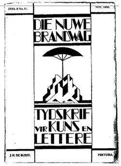 Die Nuwe Brandwag (The New Brandwag) was published over the period 1929 - November 1933 and was edited by Prof. M. L. du Toit and Pierneef. The place of its now defunct predecessor had largely been taken over by another magazine, Die Huisgenoot, so that the focus of Die Nuwe Brandwag was on literature and art of a high standard. Articles on music, sculpture and painting appeared regularly, with a large section devoted to art reproductions. It became a forum for original Afrikaans work in prose, poetry and drama, as well as hosting critiques on Afrikaans, Dutch and English literature, and is regarded by many as one of the best Afrikaans literary publications ever produced.[2]