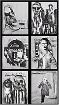 Gaber separated Die Plage into four discrete parts or movements, much like a symphony.[9] The first section is dedicated to the Weimar Republic (1918–1933)[11] and the first seven years of the Third Reich, including Hitler's rise in popularity, propaganda campaigns, the political defamation of modern art, the 1936 Olympics and the 1937 Entartete Kunst exhibition. Section II depicts persecution of the Jews. In this section, Gaber painted directly on the collages with abstract strokes of gray and blue. Section III reimagines the events in the prior two sections from more subjective points-of-view, and Section IV serves as an epilogue. The density of images within the canvases, and the rhythm of canvases within panels, change notably in each section.[9]