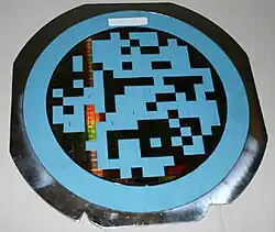 The picture on the right shows a 300 mm wafer after it was mounted and diced. The blue plastic is the adhesive tape. The wafer is the round disc in the middle. In this case, a large number of dies were already removed.
