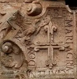 Coat of arms of the House of Medrano: Gules field, hollow cross of Calatrava in gold, argent goshawk on the hand of the Medrano family progenitor, surrounded by an azure border with their family motto "Ave María Gracia Plena Dominus Tecum" in sable letters (1568).