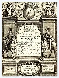 In 1640, Saavedra published the anti-Machiavellian emblem book Empresas Políticas. Idea de un príncipe político cristiano ("Political Maxims. Idea of a Christian Political Prince"), a hundred short essays about the education of a prince.[3][4] This work was written primarily for the son of King Philip IV. It passed through a number of editions and was translated in several languages. An unfinished historical work, entitled Corona gótica, castellana, y austriaca políticamente ilustrada, appeared in 1646. Another work ascribed to Saavedra, the República literaria, was published posthumously in 1670; it is a satirical discussion on some of the leading characters in the ancient and modern world of letters.[2] Saavedra's Idea de un príncipe político cristiano ("The Idea of a Christian political prince", 1640) was a very erudite work that uses the literary sort of emblem, put by Andrea Alciato with his Emblemata translated in 1549 and that has a mainly moral and philosophical character. His work, however, was mainly inspired by the Emblemata política (1618), by Jakob Bruck Angermunt, being the intention of the author to compose a guide for the suitable political formation of a Christian prince. As a historian wrote Corona gótica, castellana y austríaca (1648), that tried to be a biographical repertoire of the Visigothic kings of Spain.