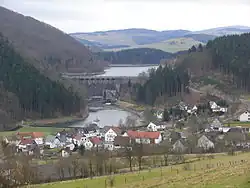 The Diemel Dam: dam and reservoir, compensating basin (Ausgleichsweiher) and power station. Foreground: the village of Helminghausen. Left: the Eisenberg | |