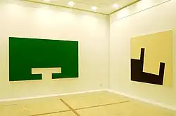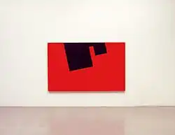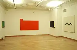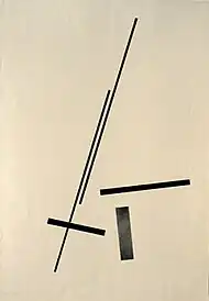 The young Diet Sayler was a great fan of Brâncuși and Malevich. At the start of his career he was above all inspired by Suprematism and Russian Revolution art. He studied the theories and works of the De Stijl and Bauhaus artists. Later he borrowed from Dadaism the principle of chance, on which his own works are based.[6] Sayler arrived at Concrete art by opposing political reality and the doctrine of socialist realism. The drive for change is a central theme in his work.[7] Sayler's early works are highly colorful. In the years of rejection and opposition color disappeared from his work, which became black and white. Following the culture shock of emigration he concentrated on thin lines on white canvases. Towards the end of the 1980s Sayler developed a system of basic elements, which became a repertoire of his painting. Color returned.[8] He produced his ‘Paintings Pieces’, ‘Bivalences’ and ‘Throw Pieces’.[9] The late 1990s saw the creation of wall pieces or ‘Bodies’ and Engrams (‘Norigrammes’) as site-specific installations in the urban architecture.[10] Parallel to this he developed site-specific "Fugues" for the rooms of museums, churches or galleries.