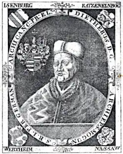 Diether von Isenburg (c. 1412 – 7 May 1482) was twice Archbishop (1459–1461 and 1475–1482) and founder of the University of Mainz. As Archbishop of Mainz, he was ex officio Elector and Lord Chancellor of Germany.[1]