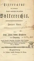 - Dietrich Heinrich Ludwig von Ompteda: Literatur des ges. sowohl natürlichen als positiven Völkerrechts. Regensburg 1785 (dem kursächsischen Comtialgesandten Carl Anton Friedrich Graf von Hohenthal gewidmet)