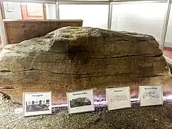 The Dighton Rock is a 40-ton boulder, originally located in the riverbed of the Taunton River at Berkley, Massachusetts (formerly part of the town of Dighton). The rock is noted for its petroglyphs ("primarily lines, geometric shapes, and schematic drawings of people, along with writing, both verified and not."),[2] carved designs of ancient and uncertain origin, and the controversy about their creators. In 1963, during construction of a coffer dam, state officials removed the rock from the river for preservation. It was installed in a museum in the nearby Dighton Rock State Park. In 1971, it was listed on the National Register of Historic Places (NRHP).