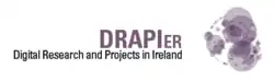 DRAPIer (backronym to Digital Research and Projects in Ireland) was an interactive database of digital humanities projects created by third level institutions on the island of Ireland. DRAPIer was named after Drapier's Letters - a series of seven pamphlets written between 1724 and 1725 by Dean Jonathan Swift of St Patrick's Cathedral, Dublin. The text used in creating the logo was taken from Drapier's Letters. The visualisation was created using a simple text analysis routine written within Processing, an open source programming environment. Each purple circle represents one unique word within the text. The circle's radius is directly proportional to the number of occurrences of the word within the text. Each circle has the same base colour but it is semi-transparent, so that when one is plotted on top of another it appears to be darker, representing overlapping networks from human to digital.