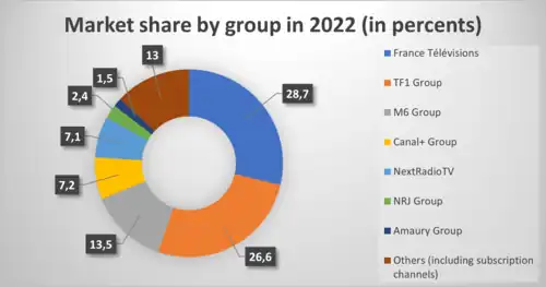 - France Télévisions, which regroups state-owned channels meaning France 2, France 3, France 4, France 5, franceinfo: and 45% of Arte's shares