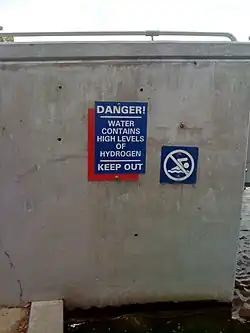 - In 2006, in Louisville, Kentucky, David Karem, executive director of the Waterfront Development Corporation, a public body that operates Waterfront Park, wished to deter bathers from using a large public fountain. "Counting on a lack of understanding about water's chemical makeup", he arranged for signs reading: "DANGER! – WATER CONTAINS HIGH LEVELS OF HYDROGEN – KEEP OUT" to be posted on the fountain at public expense.[13]
