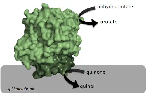 These enzymes differ from class 1 dihydroorotate dehydrogenases (DHODH) on the electron acceptor, on their structure, and on their cellular localization. Since the reaction catalyzed by DHOQOs is both part of the electron transport chain and the pyrimidine de novo synthesis, it has been explored as a possible target for cancer treatment, immunological disorders and bacterial/viral infections.[6][7][8]