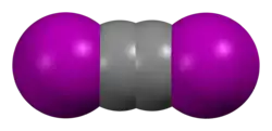 Diiodoacetylene is the organoiodine compound with the formula C2I2. It is a white, volatile solid that dissolves in organic solvents. It is prepared by iodination of trimethylsilylacetylene.[1] Although samples explode above 80 °C, diiodoacetylene is the most readily handled of the dihaloacetylenes. Dichloroacetylene, for example, is more volatile and more explosive.[2] As confirmed by X-ray crystallography, diiodoacetylene is linear,[3] with the structure I−C≡C−I. It is however a shock, heat and friction sensitive compound. Like other haloalkynes, diiodoacetylene is a strong halogen bond donor.[4]