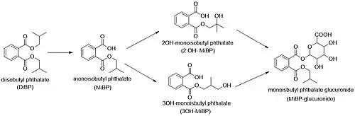 Upon entering circulation DiBP is quickly metabolized and excreted through urine, with metabolites reaching peak concentrations 2–4 hours after administration.[27] The main metabolite of DiBP is mono-isobutyl phthalate (MiBP), which makes up 70% of the excretion products. MiBP can be oxidized to either 2OH-mono-isobutyl phthalate (2OH-MiBP) or 3OH-mono-isobutyl phthalate (3OH-MiBP), which make up 20% and 1% of the excretion products respectively. These reactions are likely catalyzed by cytochrome P450 in the liver.[28] The ratio between MiBP and the oxidized metabolites changes depending on the amount of time that has passed since exposure.[27] The ratio between MiBP and 2OH-MiBP and that between MiBP and 3OH-MiBP show a similar trend. With the ratios being high, around 20-30:1, shortly after exposure and dropping gradually as more time passes to rest around 2-5:1. Therefore, a high ratio of oxidized metabolites to the monoester metabolite suggests that there was recent exposure to DiBP, within a few hours of measuring, while a lower ratio suggests that there has been more time since exposure. In addition to oxidation, MiBP can also undergo a glucuronidation reaction, resulting in the metabolite MiBP-glucuronide.[29]