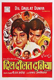 Dil Daulat Duniya (transl. Love, Wealth and the World) is a 1972 Hindi-language comedy-drama film, directed by Prem Narayan Arora and starring Rajesh Khanna, Sadhana, Ashok Kumar, Om Prakash, Sulochana, Helen and Jagdeep. The film revolves around a poor man in a palatial house who allows other newcomers in city of Mumbai to stay in his house as he feels pity on them. The music was scored by Shankar Jaikishan and songs are sung by Kishore Kumar for Rajesh Khanna. This movie was accepted by Khanna, only because he wanted to pay tribute to the acting talents of his seniors Ashok Kumar and Om Prakash, as his name would ensure that distributors would sell the film and it would reach a larger audience. The newspaper "The Hindu", in its review said "Ashok Kumar and Om Prakash are the soul of the movie and dominate the show with their acting dexterity."[1] The film fetched 1.5 crores at the box office. As of 2012, this was among the top 10 searched movies of Khanna online.[2]
