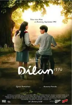 Dilan 1990 is a 2018 Indonesian coming of age romantic drama film. It is based on the novel Dilan: Dia adalah Dilanku Tahun 1990 (Dilan: He is My Dilan in 1990) by Pidi Baiq.[1][2][3][4] The film stars Iqbaal Ramadhan and Vanesha Prescilla as the main roles,[5][6] with some high-profile names in supporting, minor, or cameo roles; Farhan, Happy Salma, Adhisty Zara of idol group JKT48, and Ridwan Kamil, the then-Mayor of Bandung. The film has been watched by 6.3 million people. It is the best-selling Indonesian film of 2018 and the second best-selling Indonesian film of all time, just behind Warkop DKI Reborn: Jangkrik Boss! Part 1 with 6.8 million viewers.[7] The film is followed by a sequel, Dilan 1991, which was released on 28 February 2019.