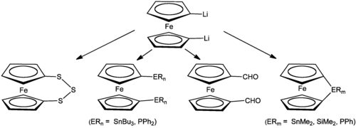 1,1'-Dilithioferrocene reacts with a variety of electrophiles to afford disubstituted derivatives of ferrocene. These electrophiles include S8 (to give 1,1'-ferrocenetrisulfide), chlorophosphines, and chlorosilanes.[3]