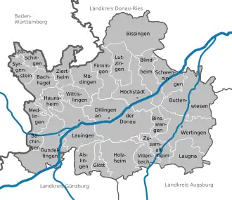 The district is crossed by the river Danube, which enters the district in the southwest and leaves to the east. All cities in the district except for Wertingen are located along the Danube.