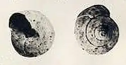The height of the shell attains 4 mm, its diameter 5 mm. The rather small shell had a trochoid shape. The surface appears smooth and shiny. The depressed spire consists of four or five subangular whorls, equipped with a broad groove between the spiral obsolete angle and slightly protruding bead that comes in above the linear and deep suture. In the middle of this groove, there is a small furrow that marks its deepest point. Above the angle, the profile of the whorls is a slightly convex. The body whorl is equal to five-sixths of the total height simply striated. It is marked by oblique growth lines. The periphery is obtusely subangular, non keeled, but rather rounded. The base of the shell is slightly convex and smooth. The aperture is round. The peristome is discontinuous and thin, except in the columellar region that contains a callosity.[1]