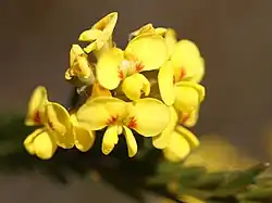 Dillwynia elegans, also known as parrot-pea or eggs and bacon,[2] is a species of flowering plant in the family Fabaceae and is endemic to eastern New South Wales. It is an erect shrub with more or less cylindrical, grooved leaves and yellow flowers with red markings.