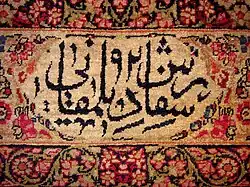 The Dilmaghani family were of Azerbaijani origin, and were largely wholesale general merchants, or tujjar (Khan al-Tujjar), as well as sarraf, or bankers.[1] The first account of the Dilmaghani family that relates to carpet manufacturing and trade traces from the 1850s; first in Tabriz and later in Kermān.[1] The Dilmaghanis were also involved in the export of dried fruit to Russia and Turkey working through agents throughout Persia and representatives in Constantinople.[1][8]