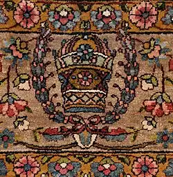 Post first quarter 20th century examples are either modestly signed, or bear the firm's trademark Crown with laurel, known as the Cyrus Crown.[6] Mid-century unauthorized replicas of the firm's Crown Kerman carpets are often referred to as "Imperial Crown" or "Crown Royal" Kermans. These and other permutations using the word "Crown" were created by other manufacturers to ride on the clout of true Cyrus Crown Carpets[7] as well as the Dilmaghani firm.