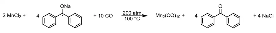 A more efficient preparation was developed in 1958 and entails reduction of anhydrous manganese(II) chloride with sodium benzophenone ketyl radical under similarly high pressures (200 atm) of CO.[6] The yield is ~32%.