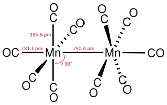 - ^ Churchill, Melvyn Rowen; Amoh, Kwame N.; Wasserman, Harvey J. (May 1981). "Redetermination of the crystal structure of dimanganese decacarbonyl and determination of the crystal structure of dirhenium decacarbonyl. Revised values for the manganese-manganese and rhenium-rhenium bond lengths in dimanganese decacarbonyl and dirhenium decacarbonyl". Inorganic Chemistry. 20 (5): 1609–1611. doi:10.1021/ic50219a056. ISSN 0020-1669.
